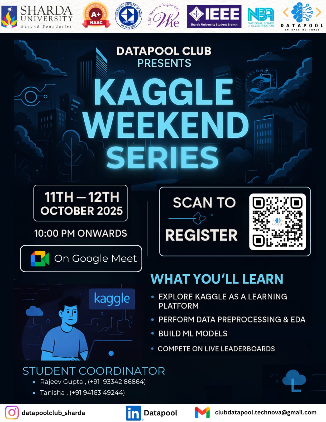 Organized by DatapoolHey Data Enthusiasts 👋 Ready to strengthen your portfolio and explore the practical side of Machine Learning and Data Science? Join us for Kaggle Weekend Series – Phase 1, a focused 2-day hands-on online event organized by Datapool Club, Sharda University 🎓. This event is designed to help you understand how Kaggle works as a learning and competition platform, apply real-world ML techniques, and collaborate with peers in a competitive yet friendly environment. What will you learn? 📊 Getting started with Kaggle as a learning and competition platform 🔍 Data Preprocessing, Exploratory Data Analysis (EDA) & Feature Engineering 🤖 Building and training Machine Learning models 🏆 Competing on live leaderboards to test and improve your skills 📅 Dates: 11th – 12th October 2025 🕙 Time: 10:00 PM onwards 💻 Mode: Online (Google Meet) 🎟 Registration: Absolutely Free 🔗 Register here: https://luma.com/z3ykraek Student Coordinators: • Rajeev Gupta (3rd Year, B.Tech CSE–AI & ML) – +91 93342 86864 • Tanisha (2nd Year, B.Tech CSE–AI & ML) – +91 94163 49244 📩 Registered participants will receive the meeting link via email.