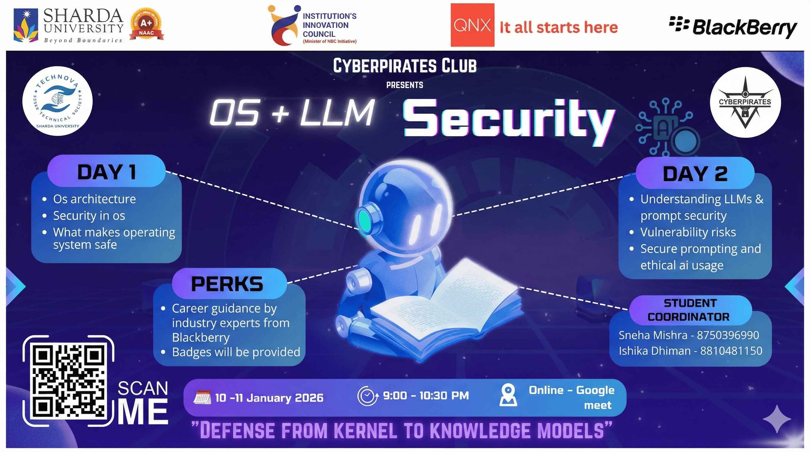 Organized by CyberPirates1. The event is a two-day online technical workshop conducted on 10–11 January 2025 at 9:00 PM IST. 2. Day 1 focuses on Operating System Security, covering system hardening, user permissions, access control, threat models, and common OS-level vulnerabilities. 3. Day 2 focuses on LLM Security, introducing prompt injection, data leakage risks, and secure AI design practices. 4. The sessions include live demonstrations, practical examples, and interactive discussions to enhance understanding of real-world security challenges. 5. Participants will receive badges and certificates, along with career guidance from an industry expert.